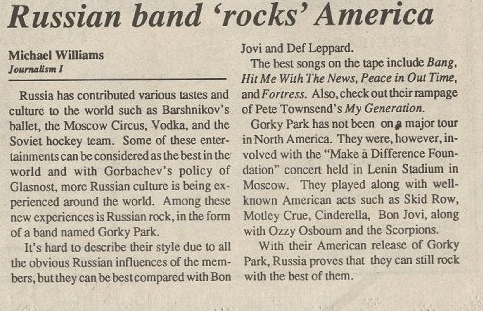 ANYWAY, one of my contributions to the paper was a review of an album by Gorky Park, a hair metal band out of Russia which, in the Era of Glasnost, had made a small splash here in the States largely due to Jon Bon Jovi taking an interest and getting them a record deal. My review ended by suggesting the band was set up for more success, a testament to my musical tastes and business acumen.